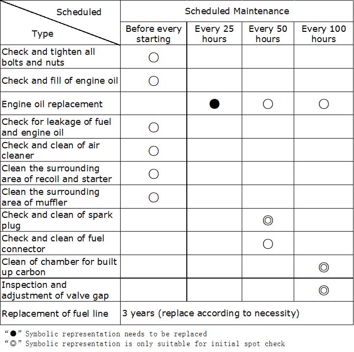 ●Drain fuel in the fuel tank and the carburetor. (Loosen the screw of the carburetor and drain the fuel) ●Remove the spark plug, add a small amout (about 2-3 cc) of engine oil into the cylinder, pull the recoil rope slowly for several times, reinstall the spark plug and release recoil rope when feel having pressure. (neutral point of decompression) ●Clean the surface with oil soaked cloth, store in cool and dry place. |